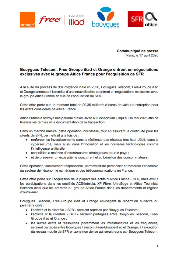 Bouygues Telecom, Free-Groupe iliad et Orange entrent en négociations exclusives avec le groupe Altice Group pour l’acquisition de SFR