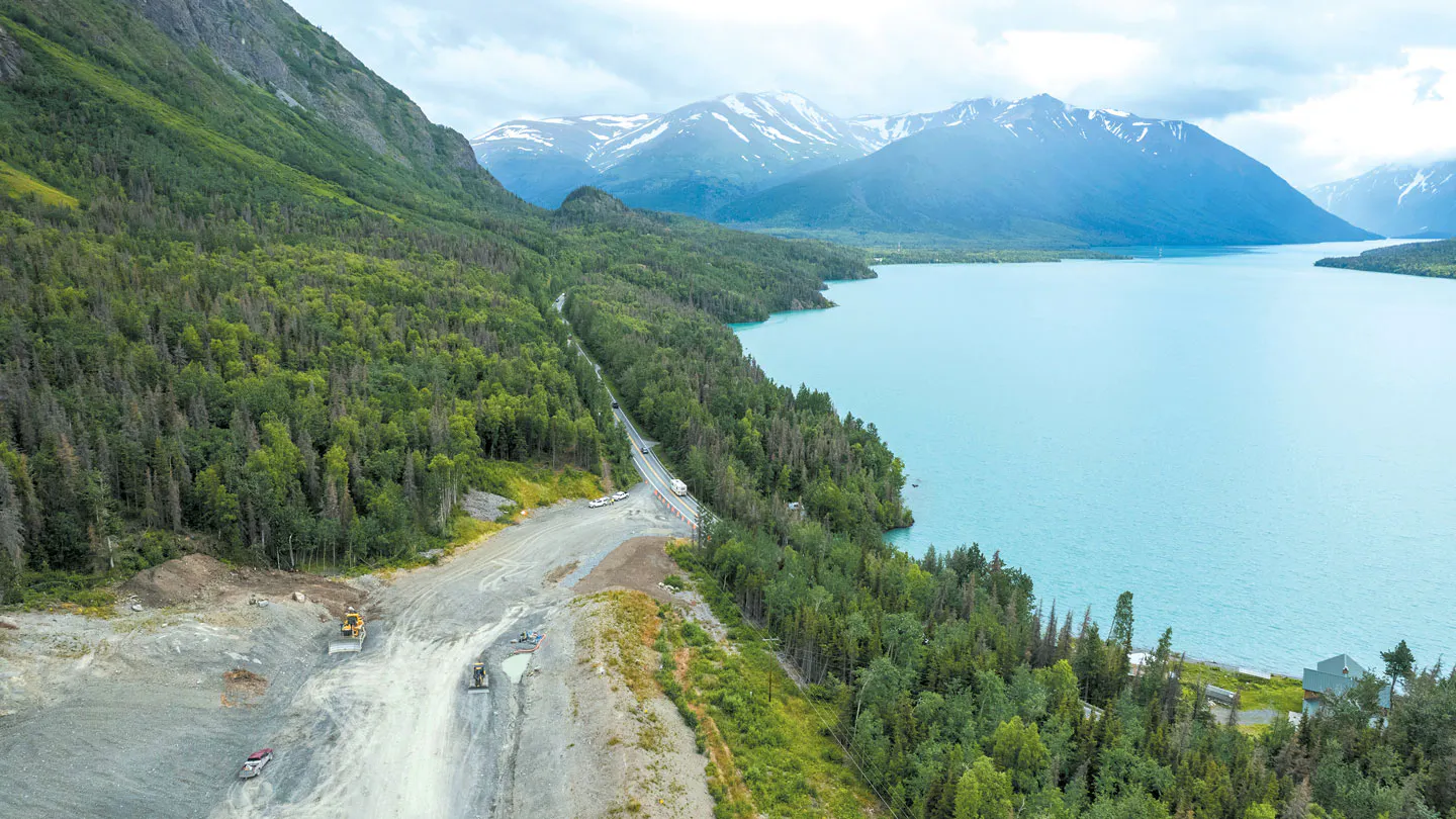 Colaska est le leader de la construction dans le 49e État des États-Unis. Dans ce territoire, les équipes évoluent du nord au sud, entre les îles, les températures polaires et le soleil de minuit. Dans un État au réseau routier peu développé, garantir la fiabilité des grands axes est essentiel. La déviation de la Sterling Highway, illustrée ici, principale route de la péninsule de Kenai, est très attendue par les populations locales. Construit dans les années 1940, cet axe routier était à l’origine une route de gravier et n’a pas été conçu pour le volume de trafic qu’il supporte aujourd’hui. En 2022, ont donc débuté les travaux pour créer cette déviation longue de 10 miles, soit 16 km.