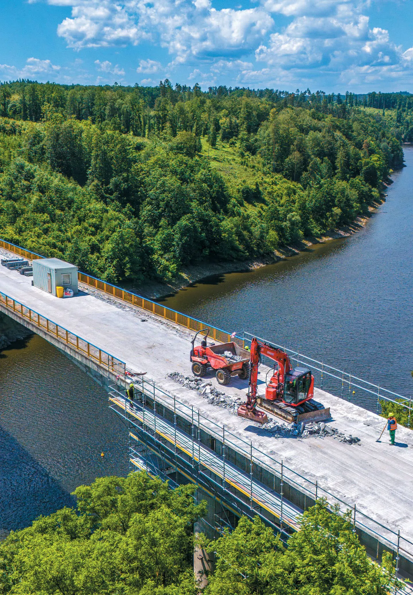 Le pont de Zvíkov, une structure de 255 mètres de long qui enjambe la rivière Vltava près du village de Zvíkovské Podhradí, fait l’objet d’une reconstruction majeure pour répondre aux exigences actuelles en matière de sécurité. L’ensemble de la structure porteuse, le système de retenue, les joints du pont, l’étanchéité, l’asphalte et les garde-corps font l’objet d’une reconstruction.
